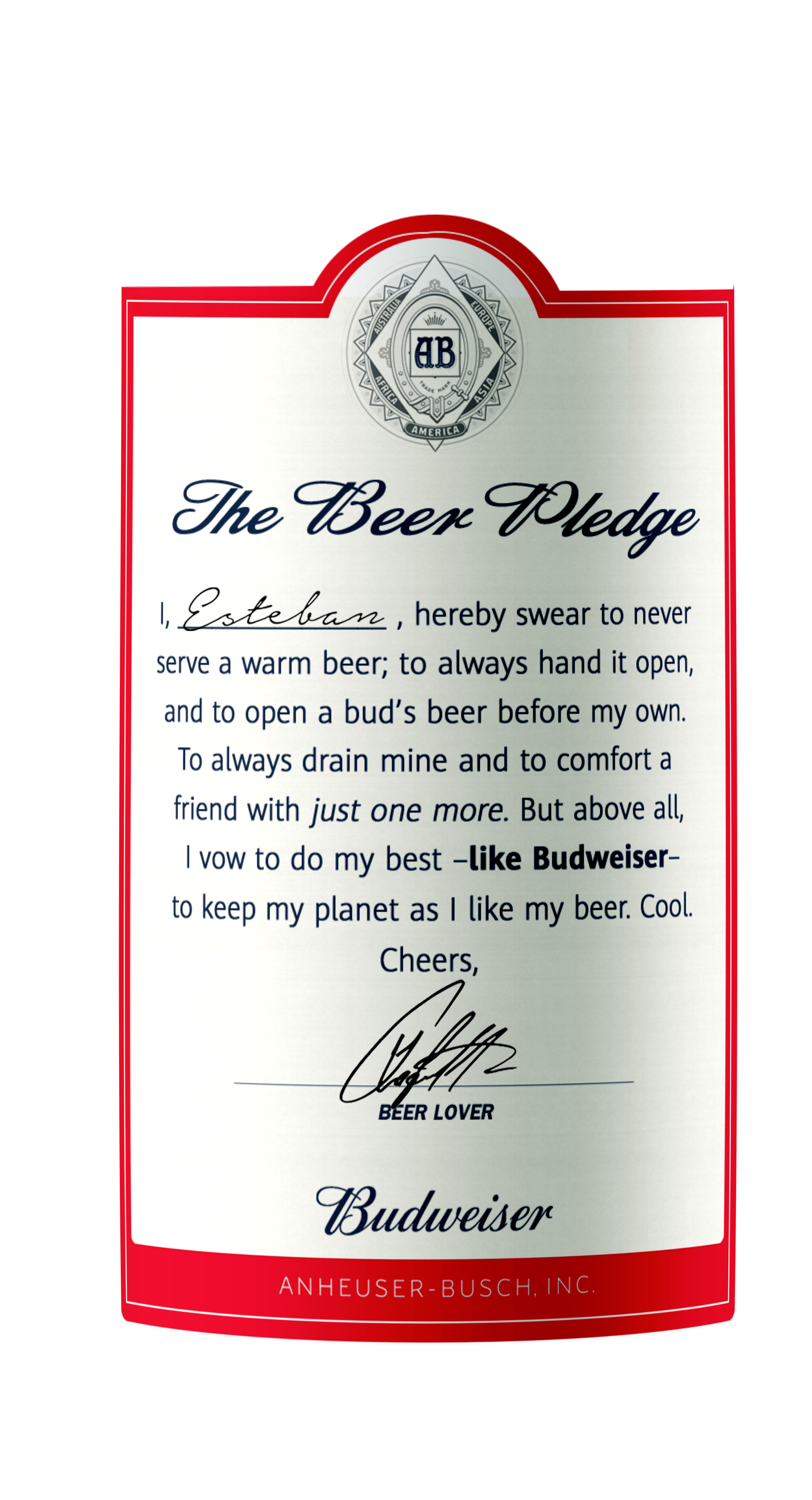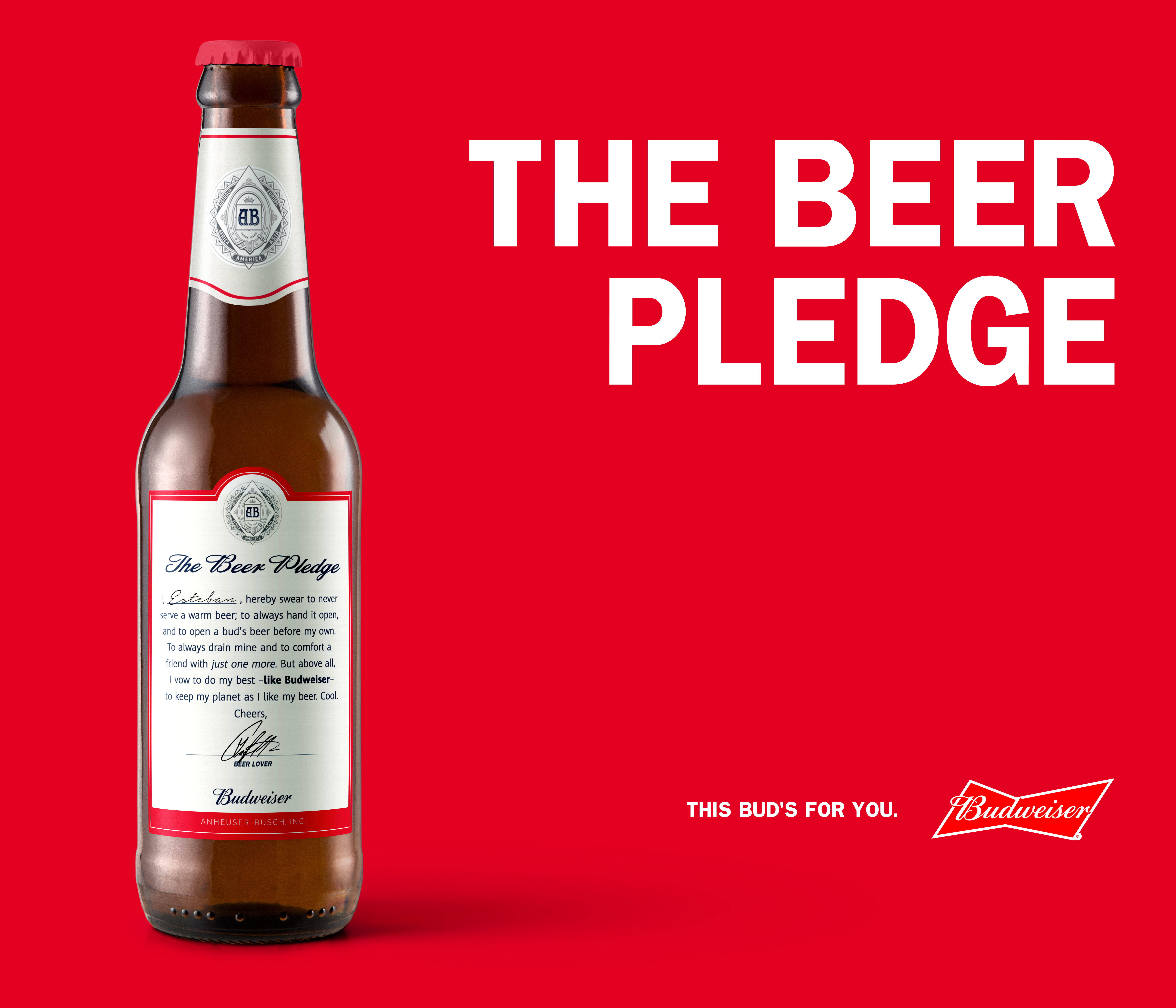 Let’s use the bottle labels as parchments to communicate Budweiser’s efforts and get people to sign the pledge. This is a pledge for beer lovers, by beer lovers. Here’s to keepin’em cold. Cheers.
