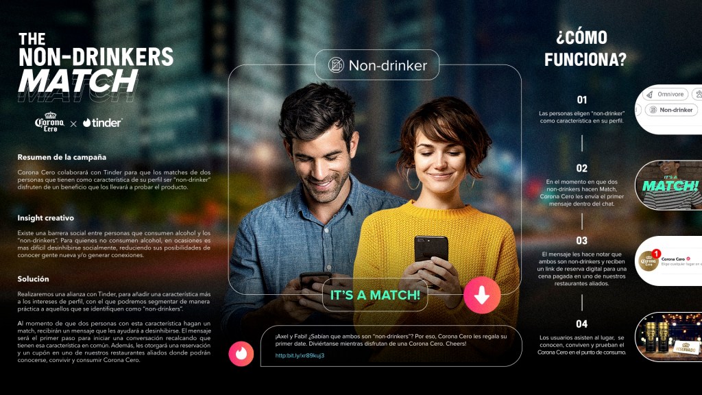 Whenever there’s a non-drinkers Match, Corona Cero sends the first message to state that their both non-drinkers and that they will have a complimentary 6-pack of alcohol-free beer for their first date.